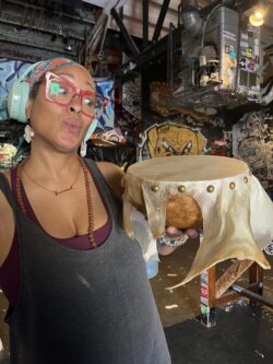 Tonya Abernathy with her completed gourd after attaching the goat skin head during a workshop series led by the Black Banjo Reclamation Project in 2025. Photo courtesy of the organization