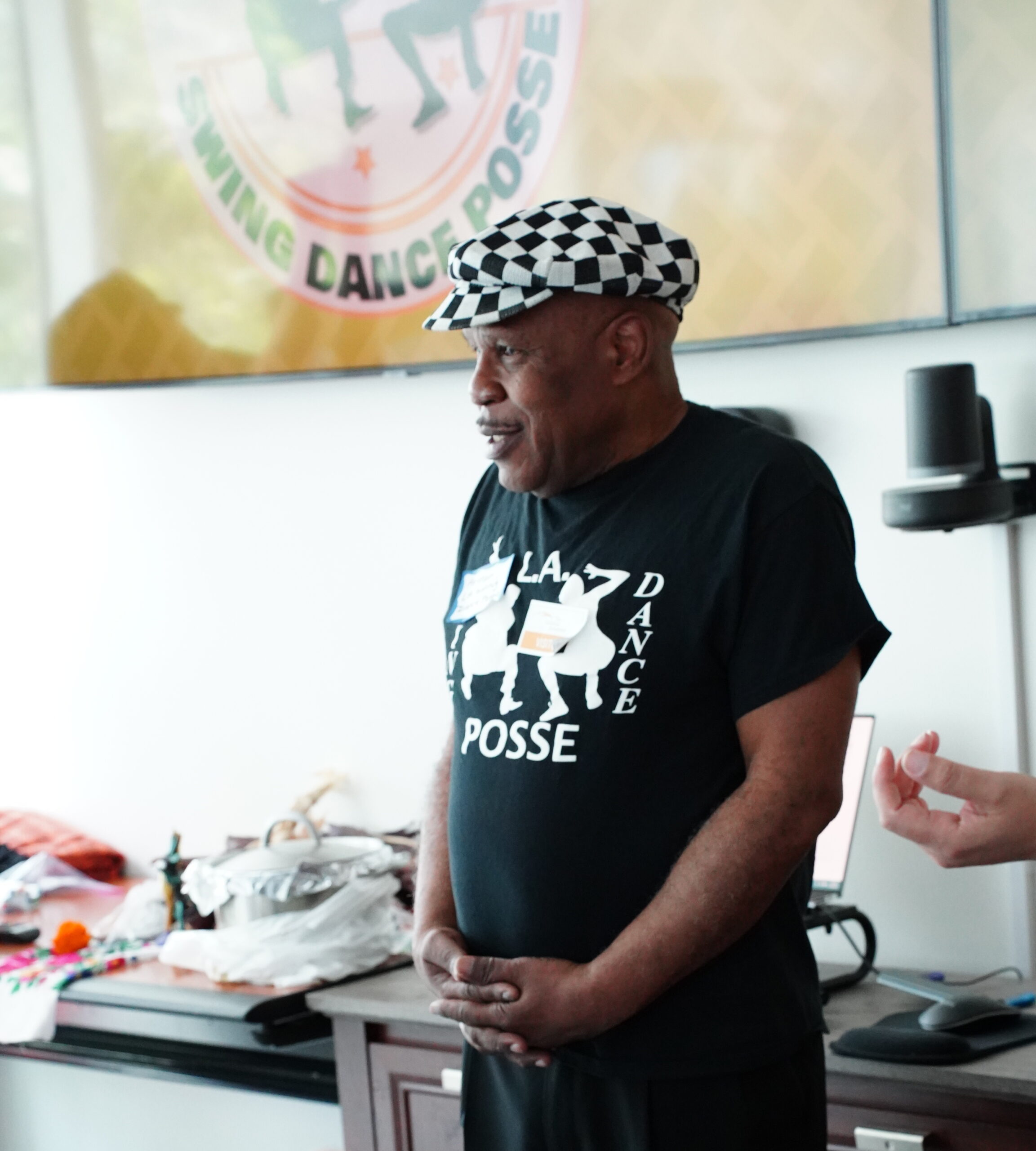 After lively group discussions, the LA Swing Dance Posse (LASDP), led by choreographer Chester A. Whitmore, brought us back together with their dynamic energy and infectious joy. True to their mission of preserving and promoting vernacular jazz dances in the African American tradition from the 1800s to the present—such as Savoy Swing, Charleston, and Lindy Hop—LASDP delivered a spirited performance that highlighted their deep commitment to cultural heritage. Chester and 4 core members of the Posse closed their presentation with a swing dance lesson that engaged participants, sparking laughter, movement, and a tangible sense of community. Their presence invoked a collective spirit and embodied the vibrant, inclusive nature of their work in dance education and performance.