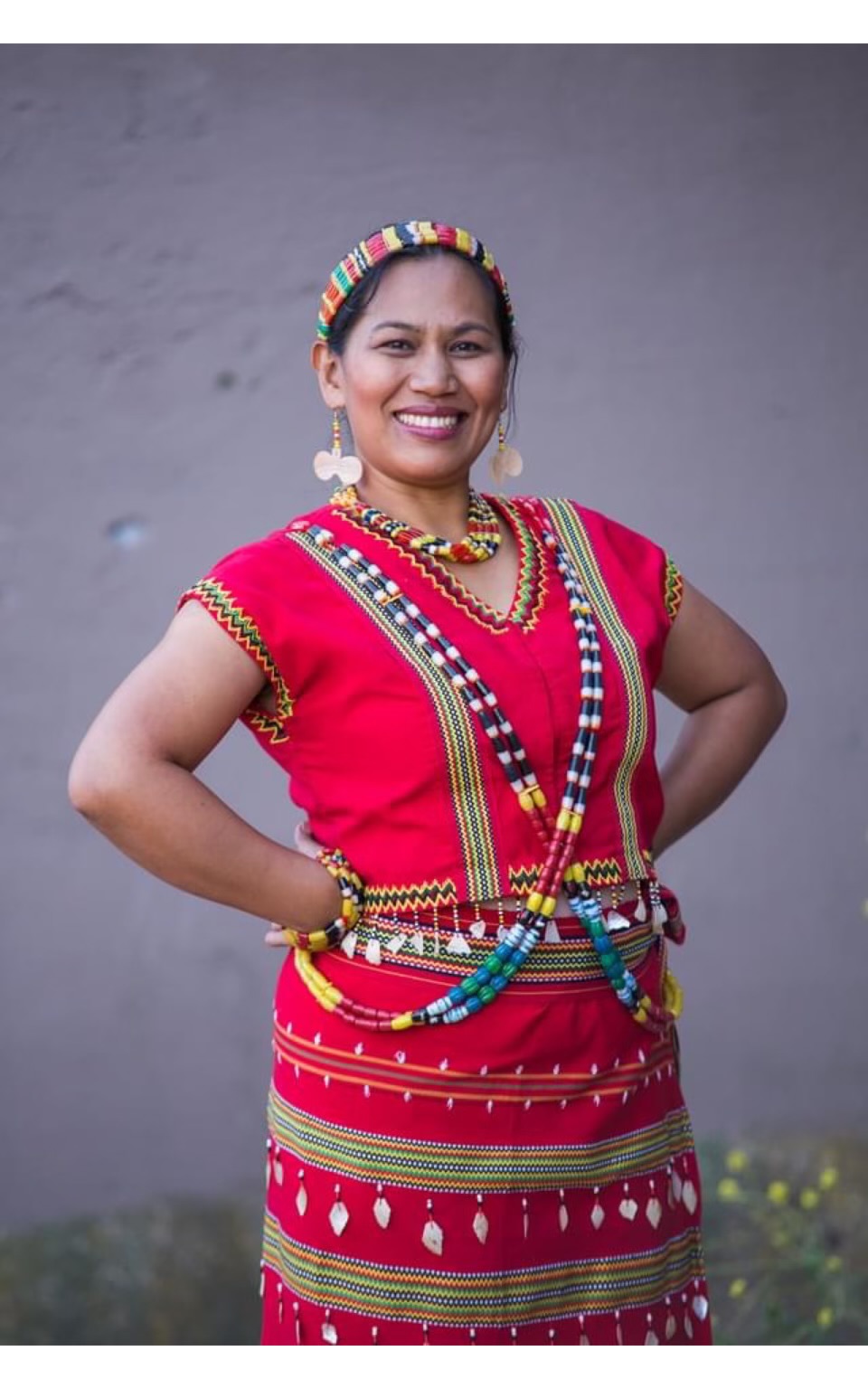 Jenny Bawer Young learned Kalinga weaving from her maternal grandmother, Mambot Cusay, and her aunt, Alice Dumatog, in her native barangay, or neighborhood, of Mabilong, Lubuagen, in the Kalinga province. Jenny began weaving as a child, creating her first belt at the age of 10. Jenny is the only Kalinga weaver to have immigrated to California, and perhaps the entire United States.