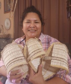 Mentor artist Julie Dick-Tex first learned to bead from her mother and watched the elders of her community doing this work, especially her aunt Annie. She first learned by working on a loom which was constructed from a tree branch and using beads from her mother’s collection. Dick-Tex is concerned about bringing more vibrancy to this practice. She shares that there are older photos of collars worn proudly by many women from their community, however, the younger generation has not engaged in this practice of wearing beaded collars, much less making them. Like many Native American tribes, the Western Mono adopted the use of glass and seed beads early on. The beaded collar, as with other beadwork, is an older adopted traditional art that is overshadowed by our basketry. The collar is a part of the traditional ceremonial dress attire and it’s important to Dick-Tex to perpetuate the art form before it is forgotten.